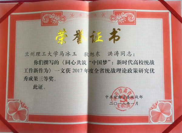 2018年1月31日,甘肃省统战部长会议在兰州召开。会议对2017年度全省统战理论政策研究优秀成果进行了通报表彰,全省共有5篇论文获一等奖,10篇论文获二等奖,15篇论文获三等奖,另有15篇论文获优秀奖。