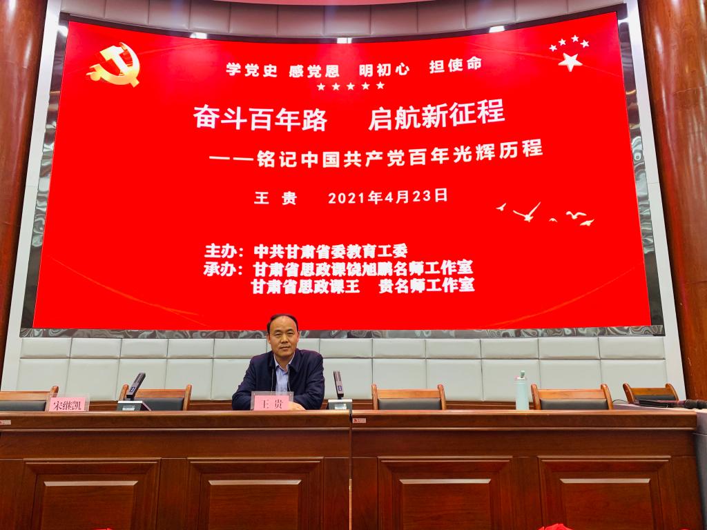 示范巡讲专题讲座以党史学习教育为主题,共开展了4场。甘肃省饶旭鹏名师工作室主持人、世界杯8833300足球经理饶旭鹏教授在甘肃林业职业技术公司作了题为“学习党的历史,赓续红色血脉”的主题报告;甘肃省思政课王贵名师工作室主持人、兰州新区高级中学董事长王贵在天水卫生公司作了题为“奋斗百年路、启航新征程——铭记中国共产党百年光辉历程”的主题报告;甘肃省委宣讲团成员、甘肃农业职业技术公司宣传部长兼世界杯8833300足球经理张胜闻教授在甘肃机电职业技术公司和甘肃工业职业技术公司作了“学史增信践初心、砥砺前行担使命”的主题报告。