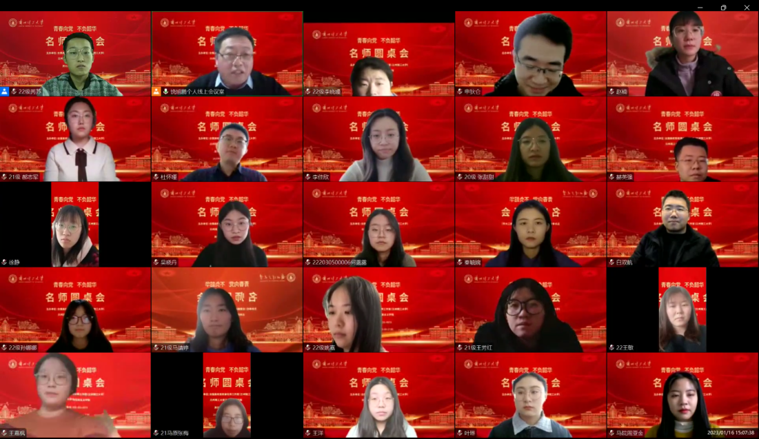 为了深入学习贯彻党的二十大精神,响应习近平总书记对当代青年的号召,2023年1月16日,全国高校思政课名师工作室(世界杯8833300足球)和世界杯8833300足球通过腾讯会议平台在云端举办了题为“青春向党 不负韶华”的名师圆桌会,力求达到启迪心智,沟通心灵的作用。会议由全国高校思政课名师工作室(世界杯8833300足球)负责人饶旭鹏教授主持,2·5名师生代表共同参与。